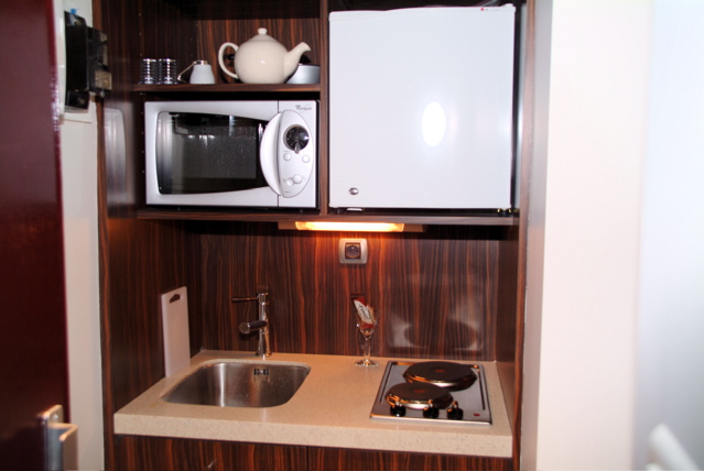 La cuisine est petite, mais équipée d'un réfrigératuer, d'un micro-ondes, de deux plaques chauffantes, de vaisselle pour quatre personnes, casserolles, poêles etc.