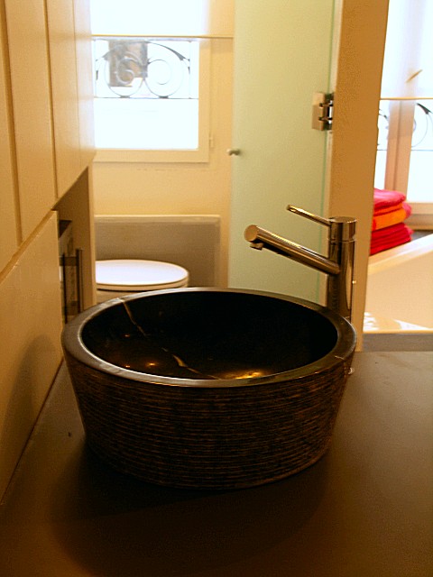 Cem's aesthetic exigence was high so I used only noble materials to match his spirit, solid teak wood, black marble in rough and polished basins shaped like sculptures and made a jacuzzi for 2 the centerpiece of the studio.