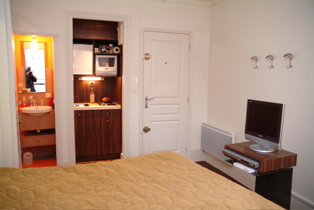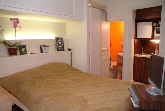 French double-bed, kitchenette with refrigerator, combined oven/microwave, 2 cooking plates, a shower cabin and separate bathroom with WC, a table/desk near the window to have breakfast, work or write a first novel.